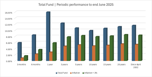 The year ended June 2025 was wrought with volatility, beginning in 2024 where 50% of the globe were partaking in presidential elections and ending in 2025 with the volatility induced by the tariffs proposed by the President of the United States. Despite this, the Fund has managed to meet its inflation target, outperforming inflation over the year ended June 2025 by an impressive 13%. The Fund has a target of inflation plus 3%, and has outperformed this target by an average of 3.9% per annum over the past 23 years, even though the investment strategy of the Fund has throughout remained conservatively positioned.